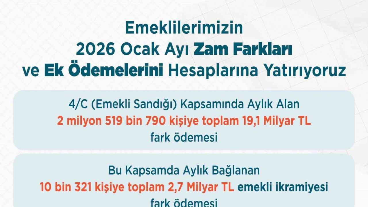 "Emekli Sandığı kapsamında emekli, malul, vazife malulü, dul veya yetim aylığı alan vatandaşlarımızın 2026 yılı zam farkları ile harp ve vazife malullüğü aylığı alan vatandaşlarımızın 2025 yılı ek ödemelerini yarın hesaplarına yatırıyoruz. Ülkemizin emektarları kıymetli emeklilerimiz başta olmak üzere vatandaşlarımıza hayırlı olmasını diliyorum."
