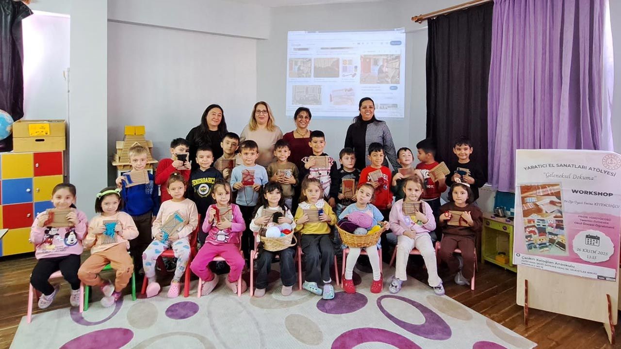 Çankırı Keloğlan Anaokulu, “Okul Öncesi Çocuklar İçin Yaratıcı El Sanatları Atölyesi Projesi” kapsamında “Geleneksel Dokuma Atölyesi” etkinliğini gerçekleştirdi. Karatekin Üniversitesi Sanat, Tasarım ve Mimarlık Fakültesi Tekstil ve Moda Tasarımı Bölümü Dr. Öğr. Üyesi Emine Ketencioğlu rehberliğinde ve Okul Öncesi Öğretmeni Yasemin Özdemir koordinasyonunda yürütülen çalışmada öğrenciler, geleneksel dokuma sanatını uygulamalı olarak deneyimledi.