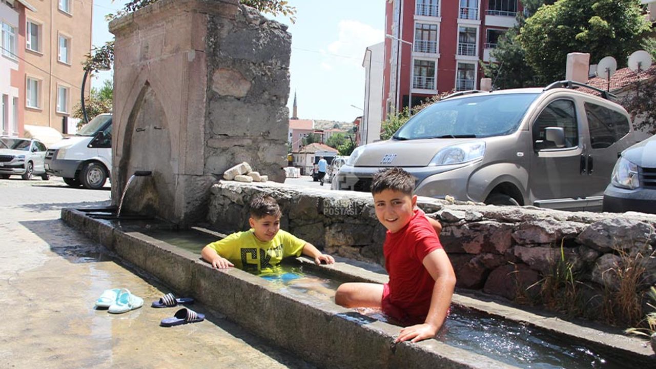 Çankırı’da etkisini sürdüren kavurucu sıcaklar, çocukları geleneksel yöntemlerle serinlemeye yönlendirdi. Kurşunlu ilçesine bağlı Müslüm Mahallesi’nde sıcak havadan bunalan çocuklar, mahalledeki tatlı su çeşmesinin oluklarında hem serinledi hem de gönüllerince eğlendi.