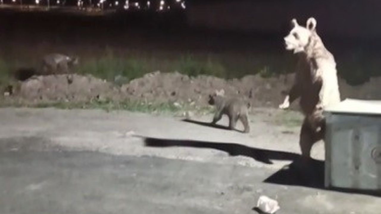 Kars’ın Sarıkamış ilçesinde boz ayılar, yavrularıyla birlikte ilçe merkezinde cirit atıyor. TOKİ Lojmanlarına kadar gelen boz ayı ve yavruları çöp konteynırını devirerek yiyecek aradı. O anları evinin balkonunda cep telefonuyla 1 kişi kaydetmeye başladı. Vatandaştan rahatsız olan anne ayı, birden balkona doğru koşmaya başladı. Vatandaş can havliyle balkondan içeri girdi. O anlar ise kayıtta olan cep telefonuyla kaydedildi.