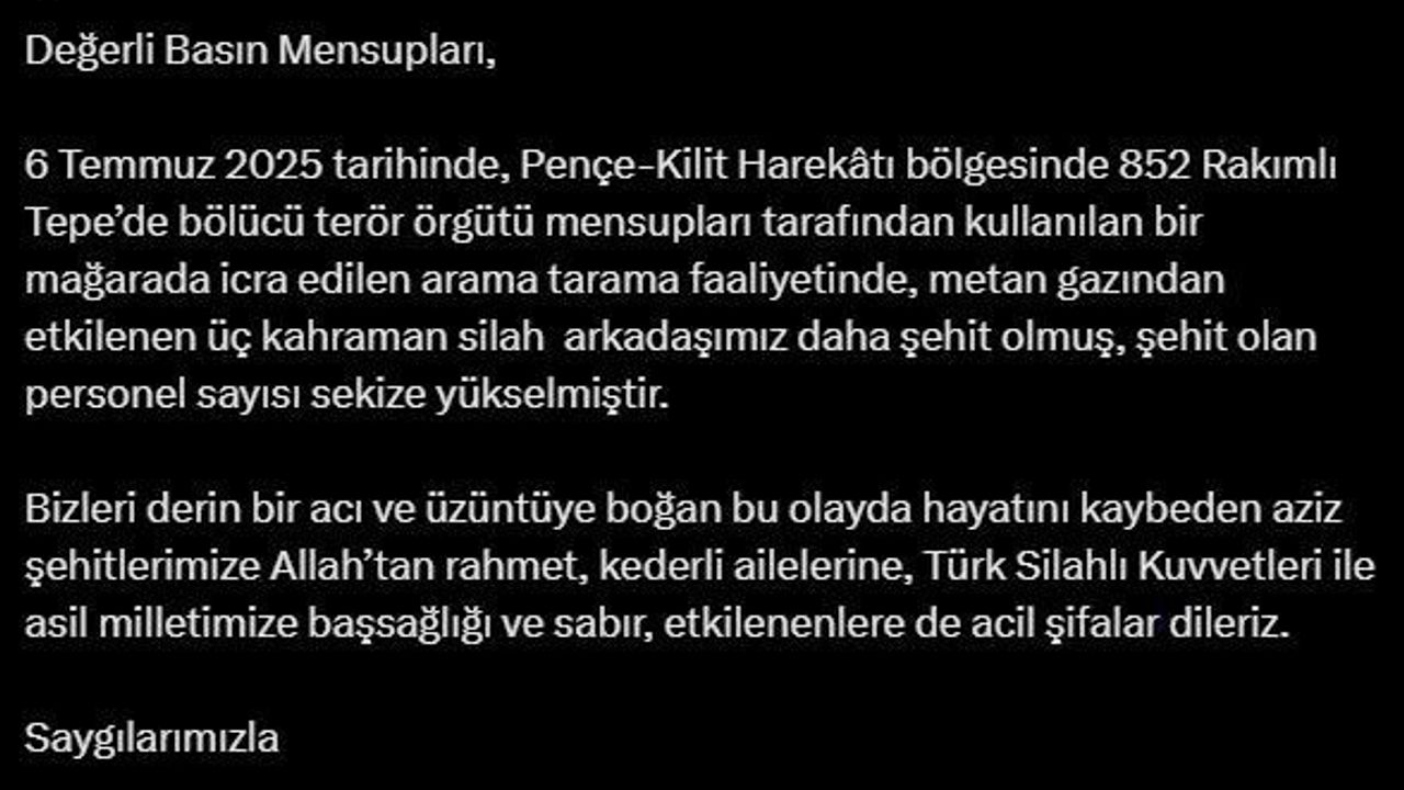 Milli Savunma Bakanlığı’nın sosyal medya hesabından yapılan paylaşımda, Pençe-Kilit Harekatı bölgesinde metan gazından etkilenen 3 askerin daha şehit olduğunu belirtilerek, "6 Temmuz, Pençe-Kilit Harekatı bölgesinde 852 rakımlı Tepe’de bölücü terör örgütü mensupları tarafından kullanılan bir mağarada icra edilen arama tarama faaliyetinde, metan gazından etkilenen üç kahraman silah arkadaşımız daha şehit olmuş, şehit olan personel sayısı sekize yükselmiştir. Bizleri derin bir acı ve üzüntüye boğan bu olayda hayatını kaybeden aziz şehitlerimize Allah’tan rahmet, kederli ailelerine, Türk Silahlı Kuvvetleri ile asil milletimize başsağlığı ve sabır, etkilenenlere de acil şifalar dileriz" ifadelerine yer verildi.